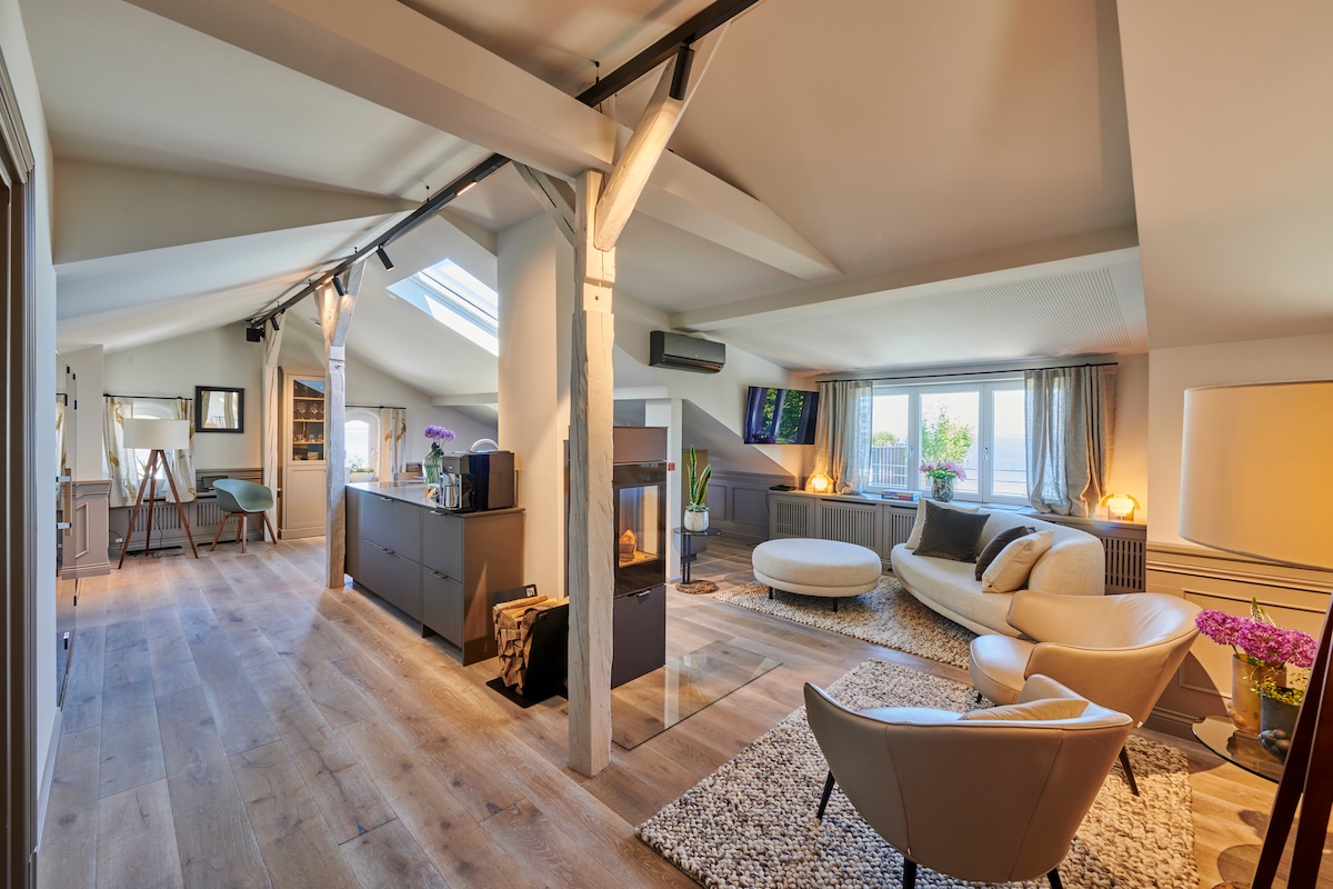 "Goldmädchen - Honeymoon Suite" In erster Meereslinie empfängt Sie eine Strandvilla der Luxus-Klasse. Die 125 Jahre alte Villa "Goldmädchen" wurde 2021 stilgetreu saniert. Entstanden sind vier großzügige, modern und exklusiv ausgestattete Apartments. Genießen Sie den Blick über die Lübecker Bucht von der Dachterrasse des Goldmädchens. Das Apartment verfügt über zwei Schlafzimmer, einen Wohn-/Essbereich mit Kücheninsel, ein Badezimmer, eine Sauna und eine große Dachterrasse zur Meerseite.