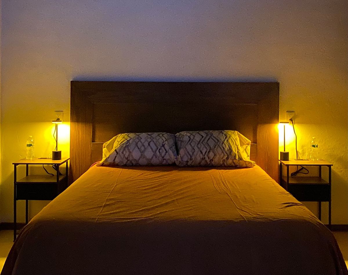 Das Loft verfügt über ein KINGSIZE-BETT (gute Matratze), einen 43-Zoll-Fernseher, einen geräumigen Kleiderschrank und eine Küchenzeile mit Gasgrill, Küchenutensilien, Gläsern, Tellern, Besteck. Das Zimmer verfügt über ein großes Fenster mit Panoramablick auf die Skyline der Stadt. Wenn du ein Fahrzeug mitbringst, kannst du es vor oder neben dem Gebäude parken, die Nachbarschaft ist sehr ruhig oder es gibt eine Pension 2 Blocks entfernt (80 $ pro Nacht von 20:00 bis 8:00 Uhr) Das Badezimmer, die Kochnische, der Salon und das Bett sind PRIVAT. (wird mit niemandem geteilt).