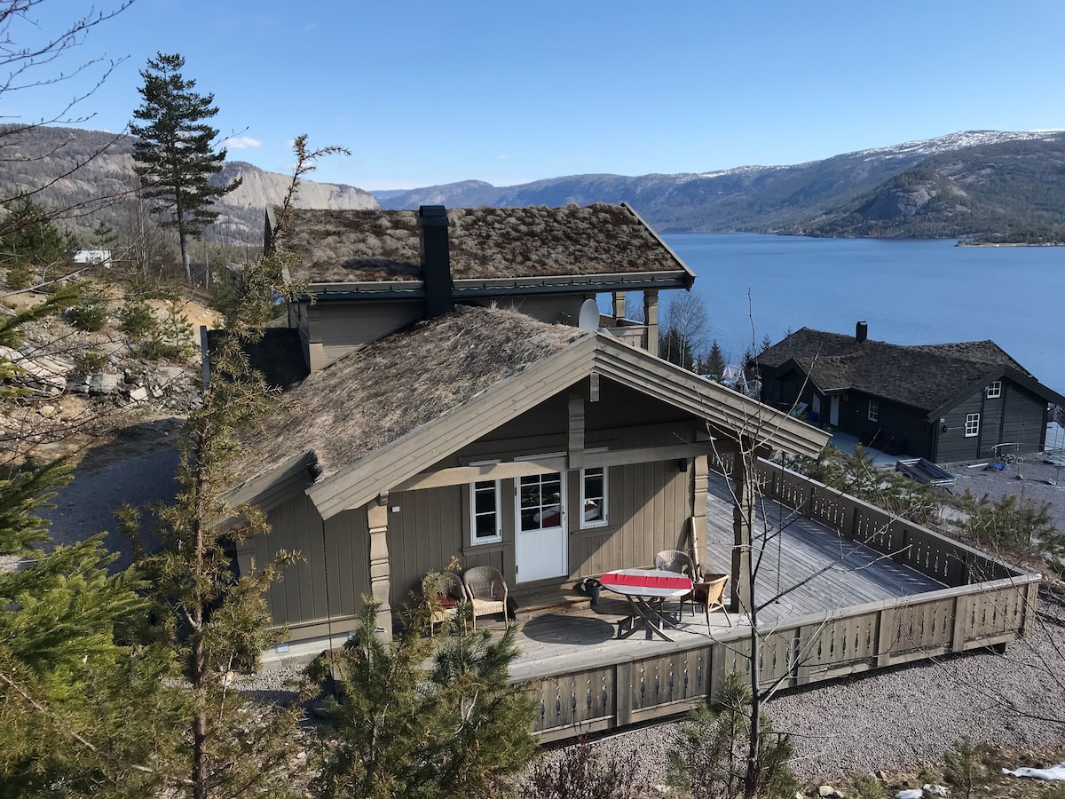 Komfortabel hytte i Vrådal med panoramautsikt over fjellet og innsjøen. Beliggende i Telemark midt i sentrum for flotte naturopplevelser og aktiviteter for barn og voksne; Padling, bading, hiking, slalom, og langrenn rett i nærheten. 3 soverom, 5 sengeplasser, en hems med leker for barn, der er det også seng. NB! Les «informasjonen om eiendommen» og «annen informasjon» før du booker. Gjester vasker hytta selv før avreise og har med håndklær og sengetøy - kan leies.