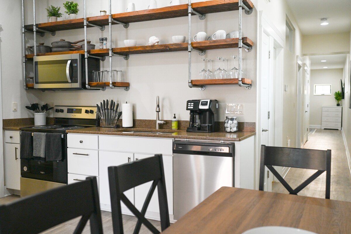 Genieße ein zweites Zuhause in dieser stilvollen und zentral gelegenen Maisonette-Wohnung. Dieses neu renovierte Haus ist familien- und kleinhaustierfreundlich und verfügt über eine Hinterhofveranda und einen 1 Morgen großen Hof. Im Inneren findest du eine gut ausgestattete Küche, ein Schlafzimmer mit Kingsize-Bett und ein Schlafzimmer mit Queensize-Bett sowie zwei Luftmatratzen und eine elektrische Pumpe für zusätzliche Gäste. Das Wohnzimmer ist gemütlich eingerichtet, einschließlich einem Schreibtisch und WLAN.