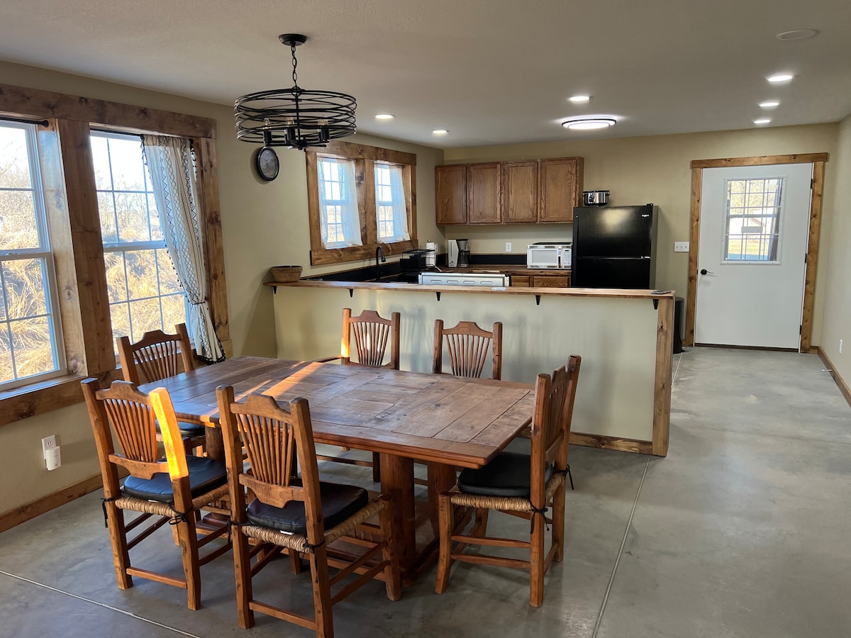 Prairie Barn Cabin ist eine rustikale, über 120 Jahre alte Scheune mit sichtbaren Balken und modernem Bauernhaus-Charme. Die Hütte bietet bequem Platz für 4 Personen mit 2 Schlafzimmern mit Queensize-Betten. Die Schlafzimmer sind über Treppen erreichbar und durch einen offenen Gang mit den freiliegenden Balken miteinander verbunden. Die voll ausgestattete Küche ist bereit für eine Mahlzeit, und es gibt einen Waschbereich zur Verwendung. Beobachte die einheimische Tierwelt im Waldgebiet rund um die Hütte, nur 3 Meilen nördlich von Iola, KS.