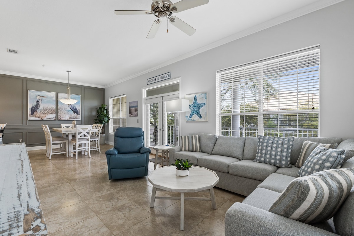 Die Einheit ist in beruhigenden Designerfarben mit Küstengefühl eingerichtet und verfügt über 2 Schlafzimmer mit komfortablen Kingsize-Betten, Flachbildfernseher und private Badezimmer; zwei Etagenbetten in Flurblake; 2,5 Badezimmer und offene Küche in voller Größe mit allen neuen Edelstahlgeräten in voller Größe, Essbereich und Wohnzimmer mit Schlafsofa. Die Unterkunft bietet Platz für acht Personen. Außerdem hast du Zugang zu allen fabelhaften Annehmlichkeiten des Waterscape Resorts! Kostenloser Strandservice mit 2 Liegestühlen und Sonnenschirm.
