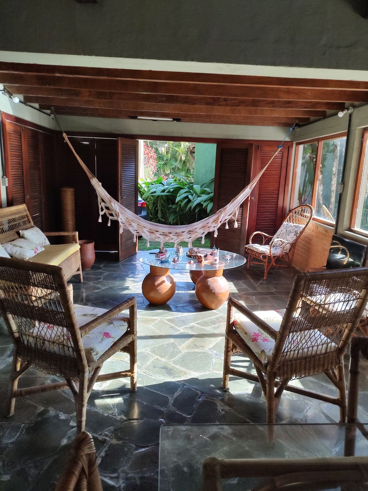 Projekt von Carlos Lemos, unser Haus ist ebenerdig, geräumig und super beleuchtet. Es liegt auf einem Grundstück mit privilegiertem Blick auf das Meer und die Berge. Es ist von der Mata Atlântica umgeben, mit wenigen Nachbarn, etwa 500 Meter vom Strand entfernt. Das Haus ist mit einer voll ausgestatteten Küche und Waschküche versehen und verfügt über schnelles Internet (100 Mb) mit WLAN in allen Räumen. Das Wohnzimmer verfügt über einen Kamin und die Veranda im Außenbereich ist sehr geräumig und mit Deck, Hängematten und tragbarem Grill ausgestattet.