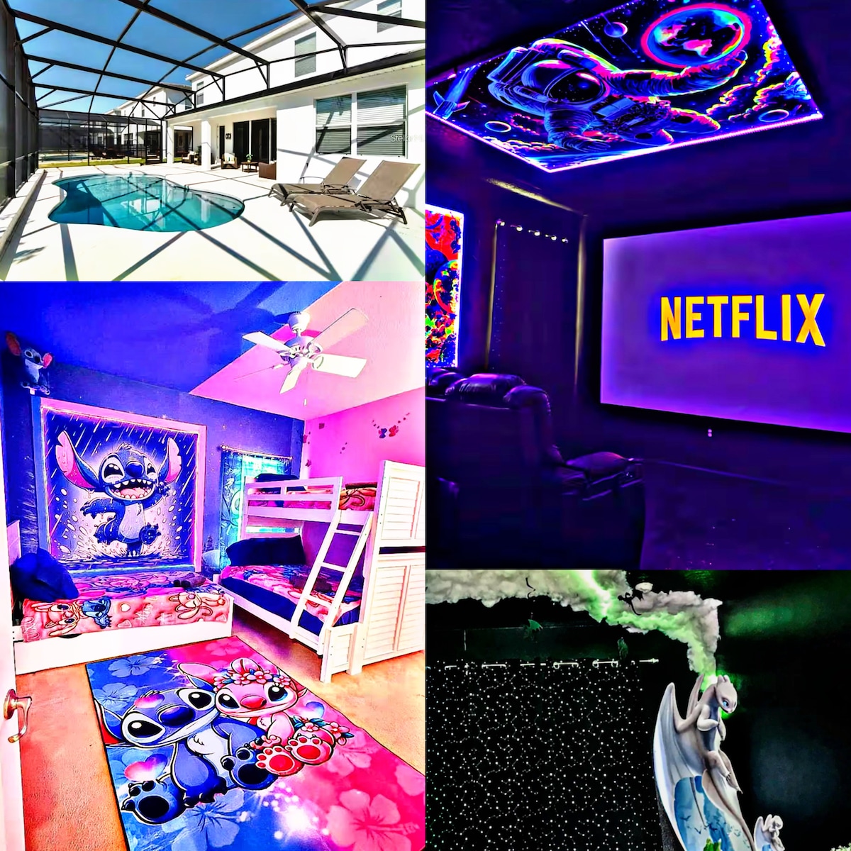 The whole family will have fun in our Magical Disney Home where the Magic of Mickey Mouse,Toy Story, Frozen and Minion bedrooms with Sensor Songs when you walk in each room, uv and Led lights.Color changing Led lights in pool + bbq area, loungers for sun tanning.This Villa has Disney Hand UV light Painted by a local artist and a Game room with air hockey arcade, your children will feel the Magic as soon as they walk in the home, from smell to sound to sight This is it!Your Magical Dream Vacation