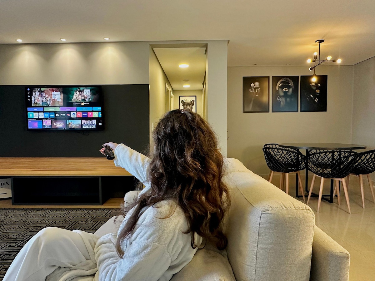 Moderne 120 m² große Apartments für bis zu 10 Gäste in der Innenstadt von Foz do Iguaçu. Komfort, Technologie und Rezeption rund um die Uhr. Voll ausgestattete Küche, privater Grill, Klimaanlage in allen Zimmern und kostenlose Parkplätze für 2 Fahrzeuge (mit Reservierung). Die Eigentumswohnung bietet komplette Freizeit: Pool, beheizter Whirlpool, Sauna, Fitnessraum, Kinderzimmer, Spielzimmer, Coworking-Space, Schönheitssalon und 24/7-Markt.