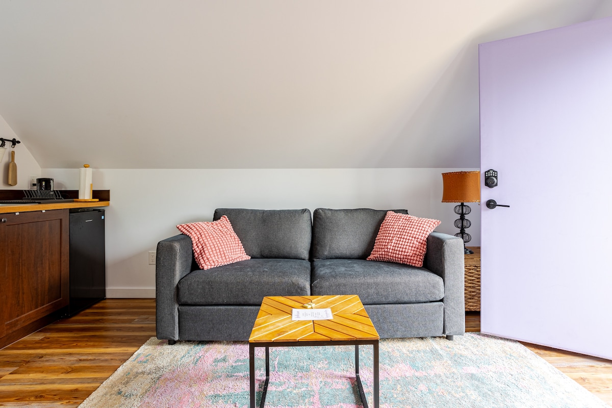 Entspanne dich bei diesem einzigartigen und ruhigen Kurzurlaub. Privates Wohnen im Innen- und Außenbereich mit Natur. Die Suite bietet eine gewölbte Decke mit Oberlichtern, die zum Ambiente beitragen, und einen beheizten Steinboden im Badezimmer. Genieße Wandern und Radfahren und eine Yoga-Plattform im Wald, direkt vor deiner Tür. Oder verbringe einfach Zeit auf der Terrasse mit einer Tasse Kaffee. Ein zehnminütiger Spaziergang bringt dich zu einem fabelhaften Bach und Wasserfall. Das Gästehaus ist an das Haupthaus angeschlossen, aber Eingang und Wohnbereich sind privat.