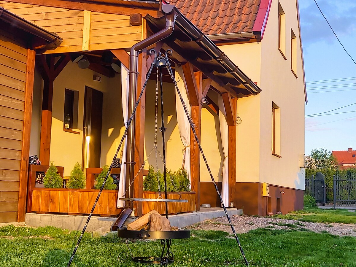 Mein kleines Holzhäuschen ( 30m2) , mitten im Grünen eignet sich besonders für Familien mit Kindern ( ab 5 Jahren- wegen der etwas steilen Treppe ins Obergeschoss.) Es ist voll ausgestattet mit 55 ZollTV , Kühlschrank, 2 Kochplatten, Microwelle mit Grillfunktion, und ausreichend Geschirr. Für Nutzung von Fahrrädern, Sauna und Whirlpool freue ich mit über eine kleine Unterhaltungsspende . Ich wohne im Nebenhaus und stehe Ihnen mit Rat und Tat zur Seite. Ich spreche Polnisch und Deutsch.