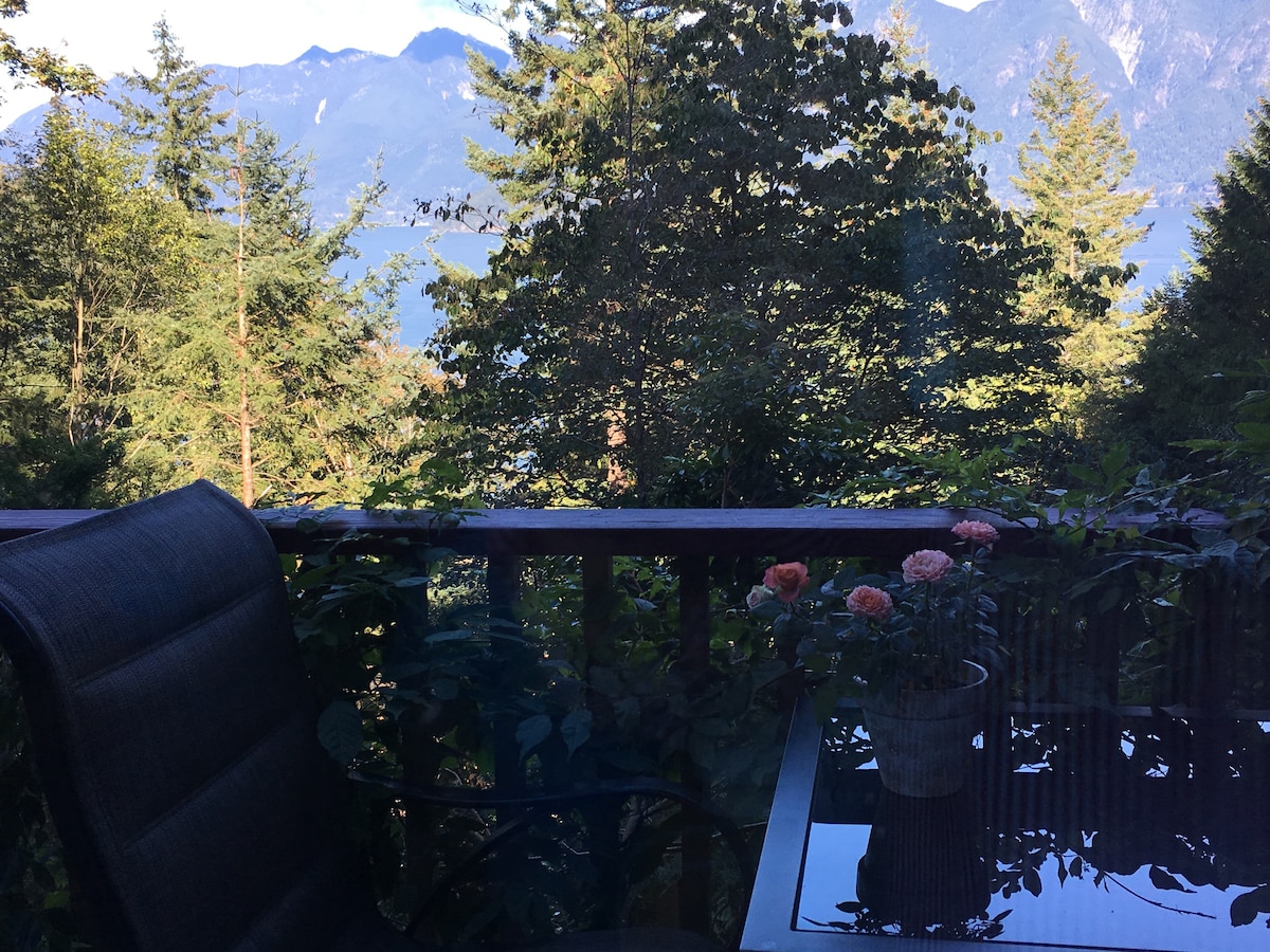 Direkt am Meer mit herrlichem Blick auf Howe Sound/Coastal Mountains (oben im Foto). In der Nähe von Stadt, Fähre, Restaurants. Ein 10-minütiger Spaziergang durch unseren Wald führt zu unserem Strand, der zum Schwimmen einlädt. Die Suite ist neu renoviert und verfügt über einen Steinkamineinsatz, ein Queensize-Bett, ein neues Schlafsofa, einen schlüssellosen Eingang und eine private Terrasse (Bettwäsche und Handtücher werden bereitgestellt). Die Küchenzeile verfügt über eine Mikrowelle, einen kleinen Kühlschrank, einen Infrarot-Einzelbrenner, einen Wasserspender, Kaffee-/Espressomaschinen, Geschirr, kein Waschbecken (wir machen das Geschirr für dich). BL#00000625