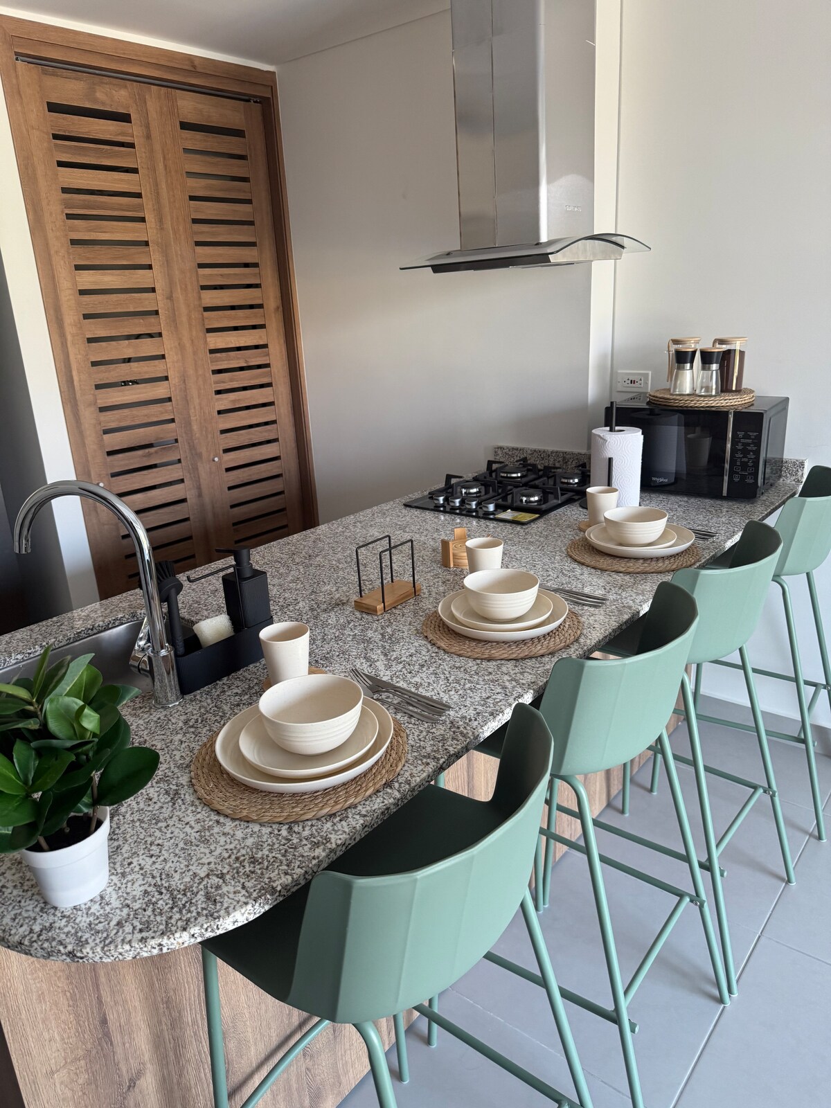 Charmante Luxussuite in Santa Marta, ideal für Paare, Familien oder Reisende, die Komfort und eine ausgezeichnete Lage suchen 🌴. Sie verfügt über ein modernes Design, eine voll ausgestattete Küche, ein Kingsize-Bett, ein Schlafsofa und einen privaten Balkon mit Blick auf die Berge, perfekt zum Entspannen. Das Gebäude bietet 2 Swimmingpools, einen Fitnessraum, einen Billardtisch, Tischtennis, Coworking, eine geräumige Lobby und einen Sicherheitsdienst rund um die Uhr. Nur 15 Minuten vom Flughafen entfernt und in der Nähe der Mall Arrecife, Supermärkte, Restaurants und Strände ✨🌊