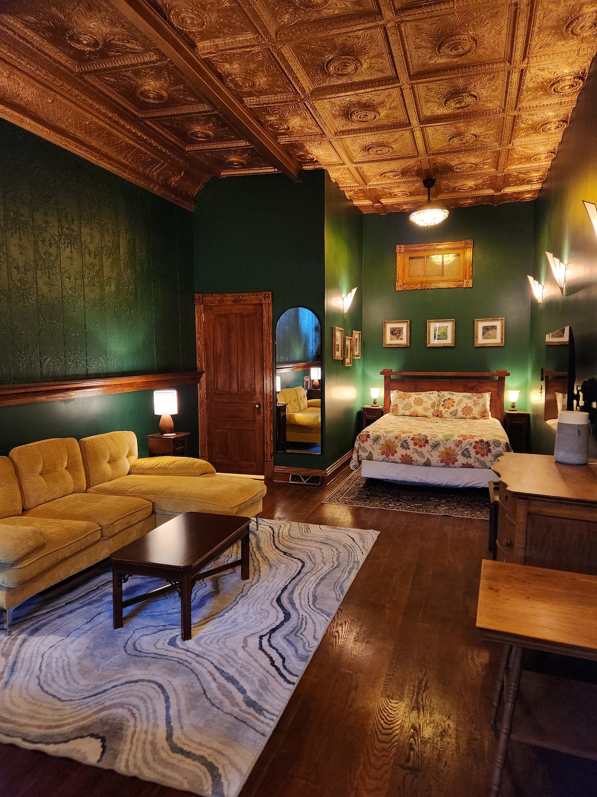 Dieses königliche Zimmer ist mit einer stattlichen grünen Damasttapete und einem großen Fenster mit Blick auf die historische Park Avenue geschmückt. Dieser geräumige und einladende Raum hinterlässt einen guten Eindruck. Es gibt auch einen antiken Plattenspieler und ein eigenes Badezimmer mit einer Wanne mit Klauenfüßen. Beinhaltet einen Roku-Fernseher, ein Doppelbett, eine Klimaanlage und Dampfwärme. Im Rahmen des Painted Cat B&B wird täglich ein leichtes Frühstück mit Selbstbedienung und Kaffee serviert, und sonntags gibt es einen Brunch. Frühstück im Preis inbegriffen.