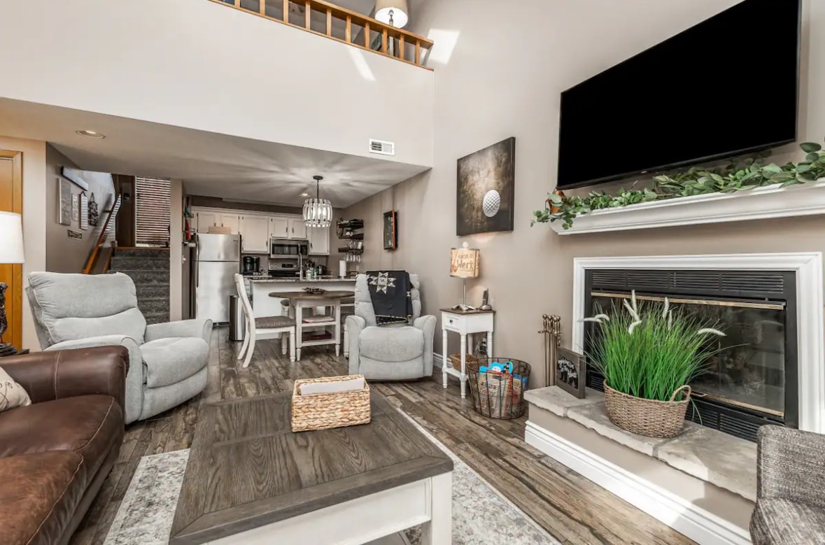 Welcome to A&D Rise Getaways @ Plum Cove Corner A bright and inviting 3-bedroom, 3-bath end-unit townhouse in The Galena Territory. We now offer 12pm check in and check out! Relax by the electric fireplace in the living room, enjoy meals in the open dining area with deck access, and spread out across three levels—including an upstairs primary suite with a desk/workspace and a finished lower level with foosball table and patio access.