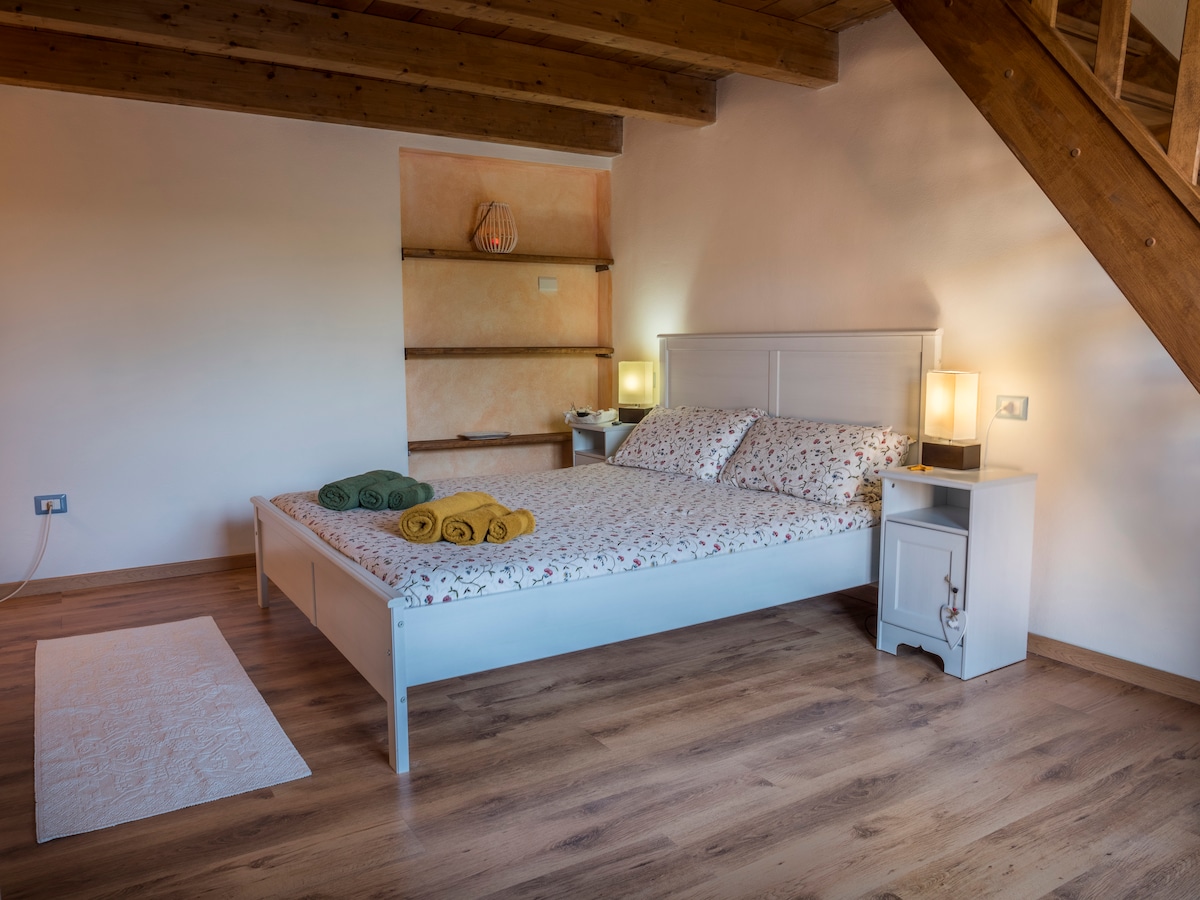 La camera al primo piano di una casa tipica offre un bagno privato con doccia, lavandino, wc e bidet. Dispone di un letto matrimoniale e una poltrona letto, ideale per un bambino fino a 12 anni. La veranda privata coperta, con vista mare, è attrezzata con tavolino e sedie.