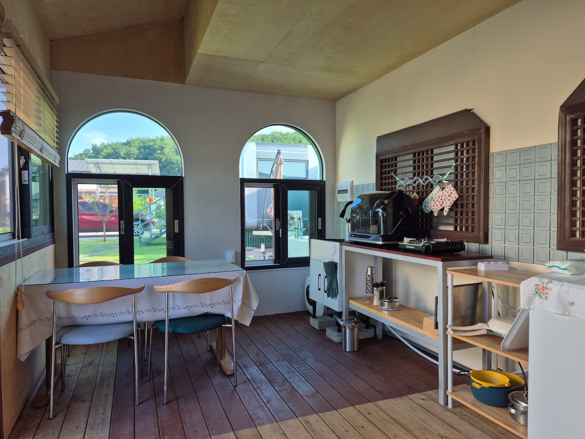 Hallo, wir sind Onda und recherchieren und stellen verschiedene Ruhebereiche zur Verfügung. Ich hoffe, dass jeder, der hier übernachten wird, eine komfortable und glückliche Zeit haben. [Unterkunft Einführung] Neu eröffnet im März 2024! 2,7 km von Dongyeoju IC, 50 Minuten wochentags von der Metropolregion entfernt. Du kannst den Grill und die Feuerstelle im geräumigen privaten Garten in vollen Zügen genießen. Im Glamping-Bereich kannst du 365 Tage lang den individuellen Warmwasserpool nutzen. Wir haben für jeden Standort so breit wie möglich, damit du dich ungestört ausruhen kannst. Alle Sehenswürdigkeiten haben einen Panoramablick und einen erfrischenden Blick. Es ist eine beruhigende Pause, The Hill Glamping. [Zimmertyp] Ein-Zimmer-Typ (Doppelbett 1, 2 Etagenbett + Küche + 1 Badezimmer) * Bettwäsche wird entsprechend der Anzahl der gebuchten Personen zur Verfügung gestellt.