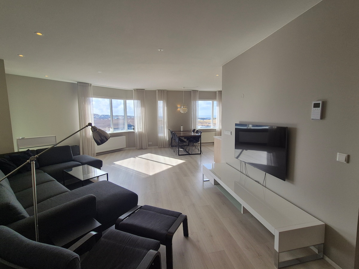 Beautiful and stylish two-bedroom apartment. The apartment is on the 3rd floor, with cozy furnished balconies. The main bedroom has a king-size bed and the second one has a brand new and comfortable sleeping couch. The living room has a big smart TV, the kitchen is fully equipped and there is a washing machine and dryer in the bathroom. The apartment is in 5 min walking distance to Bonus supermarket as well as Cosco, 212 Bistro, and Dæinn coffeehouse. Only 15 min drive to downtown Reykjavik.