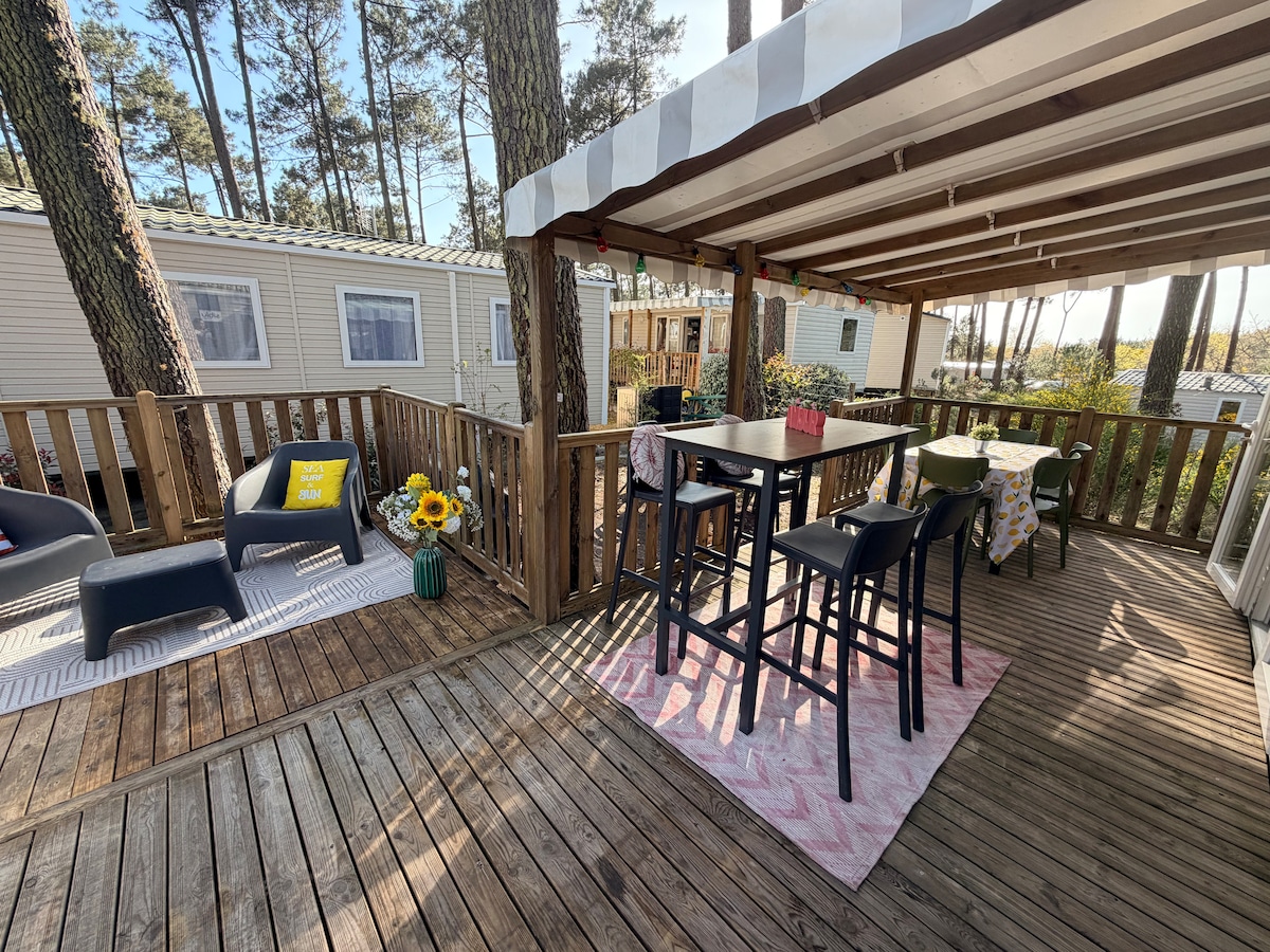 Genießen Sie die Sonne und die Süße des Lebens in den Landes. Geräumiges Mobilheim auf Campingplatz 4 ☆ "Les Fontaines de Nava" mit Schwimmbädern, Multisportplatz, Bar, Restaurant, Waschmaschine, 400 m vom See Cazaux, 3 km vom Dorf Biscarrosse, 10 km vom Meer und 30 Minuten von Arcachon und der Düne von Pilat entfernt. Direkter Zugang zu den Radwegen. Kommen Sie und probieren Sie den belebenden Cocktail, den Biscarrosse bietet: 1/3 Meer, 1/3 See und 1/3 Wald. Ohne Mäßigung das ganze Jahr über zu genießen!