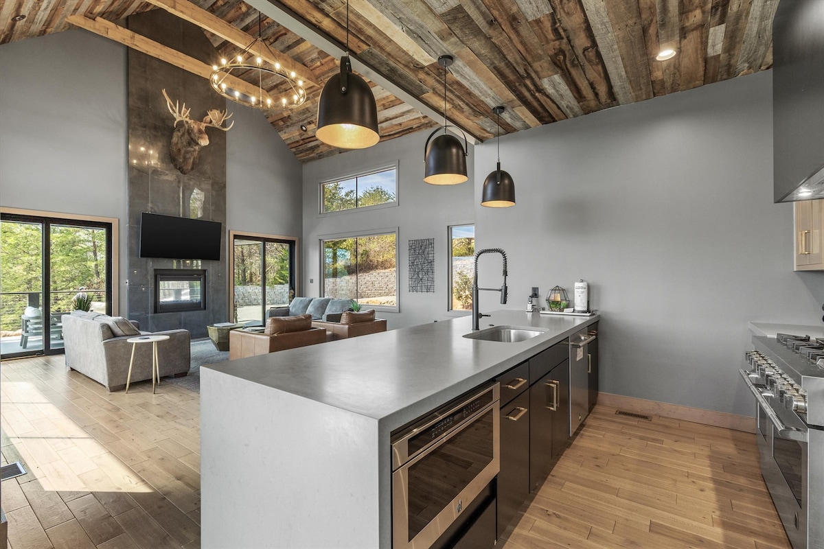 Erlebe unvergleichlichen Luxus im Windows to the Mountains, einem modernen Wunderwerk in Gatlinburg mit atemberaubendem Blick auf den Mt. Leconte. Das Chalet verfügt über eine Dachterrasse mit einem Modpool, einem Kino und exquisiten Annehmlichkeiten im Freien. Genieße eine voll ausgestattete Küche, ein gemütliches Wohnzimmer mit einem Dampfkamin und eine Master-Suite mit einem Spa-ähnlichen Badezimmer. Windows to the Mountains bietet eine Kaffeebar, Spieltische und eine Sauna und ist ein exklusiver Rückzugsort für anspruchsvolle Gäste, die einen luxuriösen Urlaub suchen.