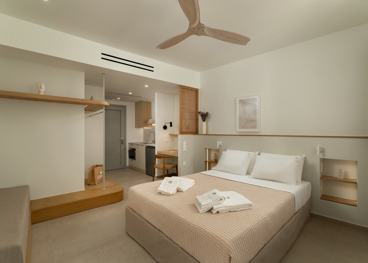 Experience the essence of Greek island living in a brand new, super cozy & comfy, 1-bedroom apartment (sleeps up to 4 in 1 bedroom and 2 built-in sofa beds). Situated just within walking distance (300m) from the lively Port of Gavrio, you'll find yourself so close to the port town full of restaurants, shops, cafes, bakeries, supermarkets, and yet in a serene neighborhood with a sea view. A small beach is just 100m away and within a 5' drive, the most popular beaches of the island.