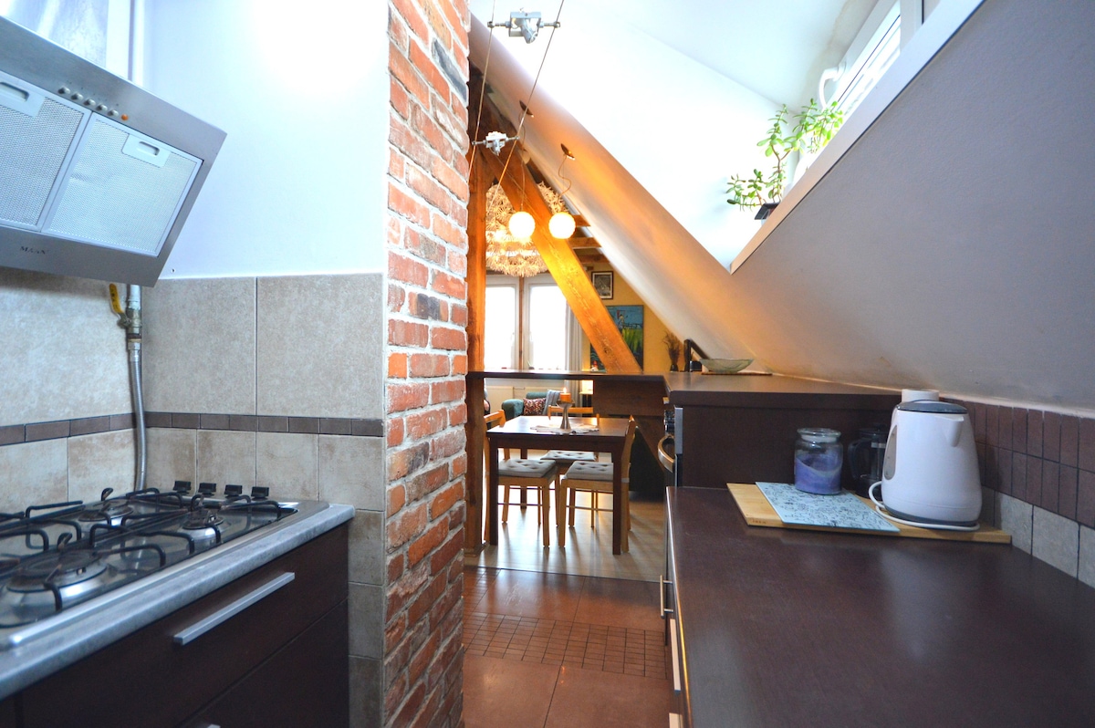 Eine einzigartige Wohnung mit einem Kamin im Dachgeschoss. Wir haben diesen Ort nur für uns selbst geschaffen, ursprünglich mit Gemälden, Büchern, einer Sammlung von Kakteen und handgefertigter Keramik. Wir haben uns um Komfort gekümmert - 2 Sessel und ein Sofa, einen Kamin und viele Kissen. Es gibt auch eine ausgestattete Küche, einen Tisch mit 4 Stühlen, einen Schreibtisch und schnelles Glasfaser-Internet. In der Nähe gibt es eine Pizzeria, eine Bar, Geschäfte, 5 min zu Fuß zum Bahnhof Danzig Oliwa.