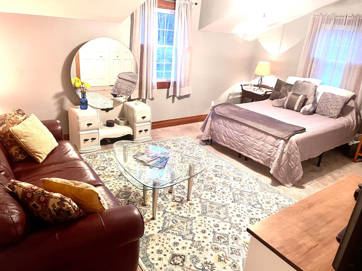 Entspanne dich in dieser gemütlichen Landgaragen-Wohnung im Grand River Valley. Die erste Station auf deiner Weingut-Tour ist nur 4 Minuten entfernt und es gibt über 30 weitere zu erkunden. Besuche den nahegelegenen Lake Erie, Thompson Ledges, das Geauga Park District Observatory oder eine überdachte Brücke. Küchenzeile mit Minikühlschrank, Mikrowelle, Keurig & Spüle. Malerisches Bad mit Stehdusche Privater Schlüsselcode-Eingang Elektrischer Kamin Kingsize-Bett Rustikale Holzschaukelstühle & Tisch Haustiere erlaubt Gemeinsamer Zugang zum Whirlpool, zur Feuerstelle im Hinterhof und zur Terrasse