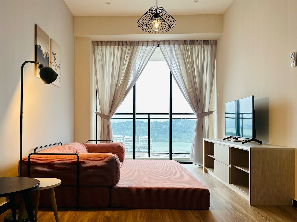 Gemütliche Studio Suite mit Meerblick (Verfügbarer Check-in nur für Selbstfahrer) Unser Aufenthalt ist eine Studio-Suite und eine private Wohnung in der Nähe der Penang-Brücke mit strategischer Lage, wo du leicht Zugang zur Penang Bridge, Queensbay Mall und Bayan Lepas Industriezone hast. Unsere Studio-Suite bietet ein Auto oder einen Motorparkplatz und es ist ein offenes Konzept-Studio ohne Schlafzimmer und Küche angeschlossen, das für junge Paare oder Familien mit kleinen Kindern geeignet ist und bequem bis zu 2 Erwachsene und 1kid beherbergen kann