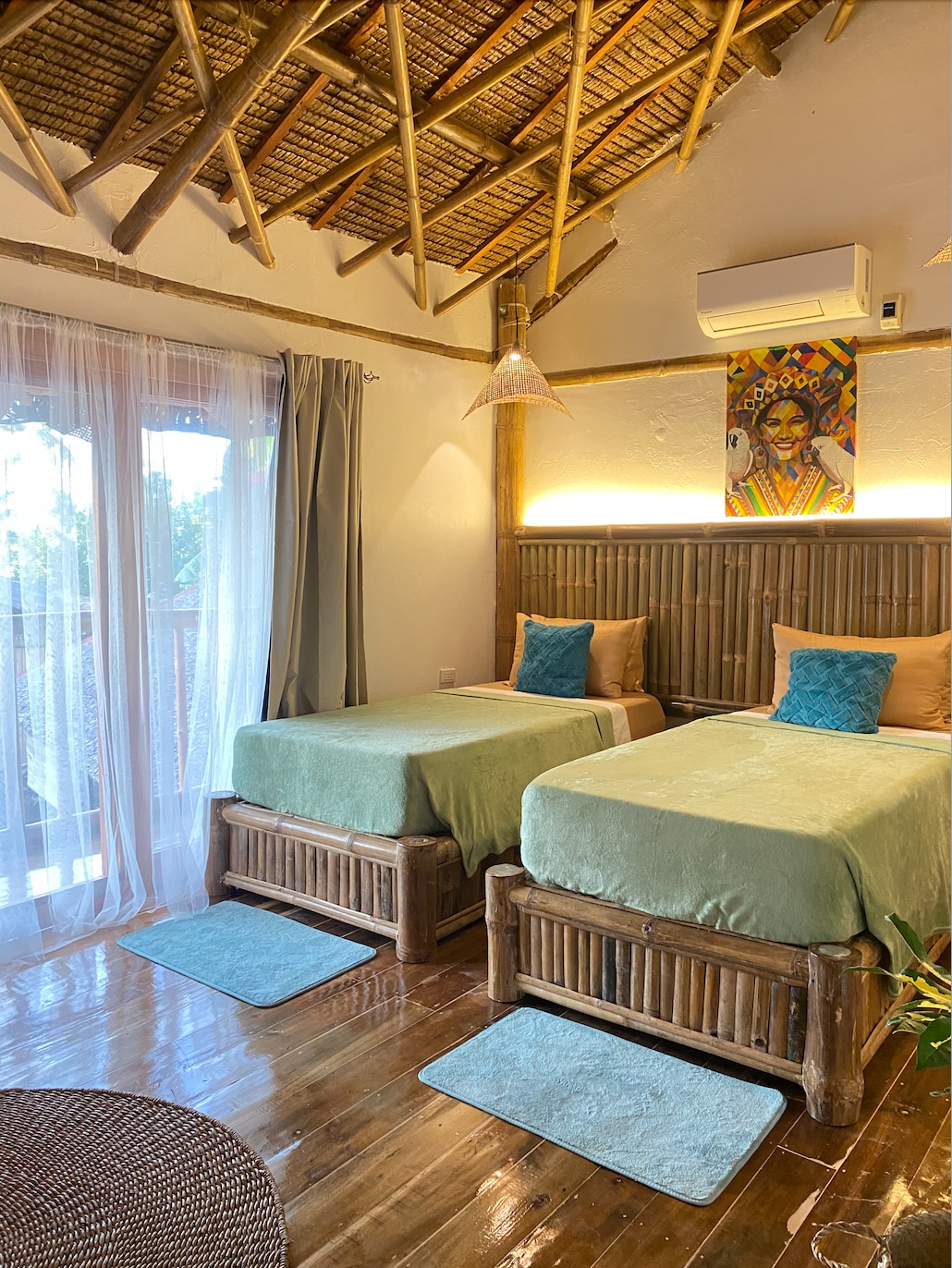 Villa Room 3 offers a calm, refined island stay just few steps from Cloud 9. The room opens to the pool and a private veranda framed by tropical gardens. Enjoy A/C, hot-cold shower, en-suite bath, vanity, and sliding glass doors that fill the space with light. Set as a queen or twins for flexible comfort. With fast WiFi, on-site café and spa, and a quiet beachfront setting, it’s perfect for guests who want privacy, ease, and a clean modern retreat in Siargao.