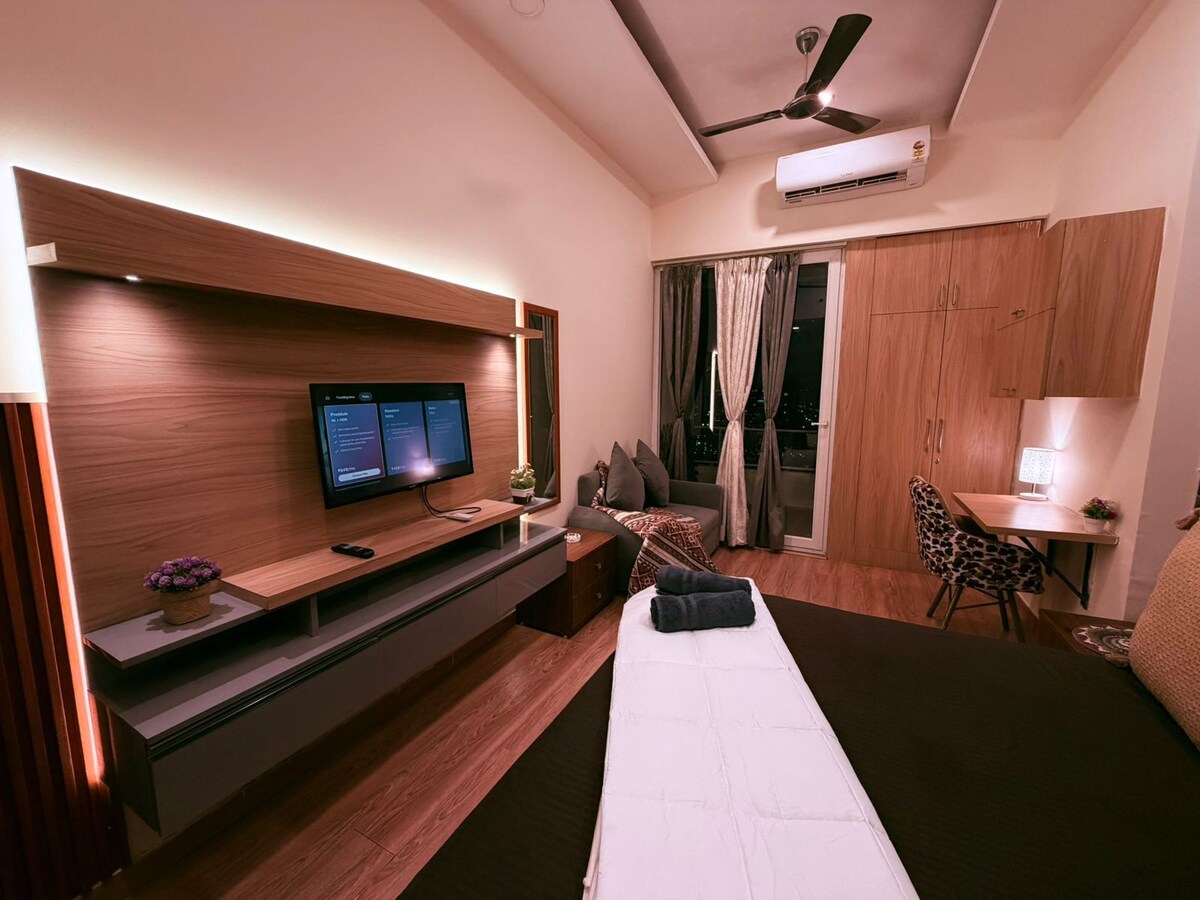 Willkommen in den Antaram Suites – Gaur City Mall, Noida! Erlebe Komfort und Bequemlichkeit im Herzen von Noida in unserer gemütlichen, gut gestalteten kompakten Wohnung direkt in der Gaur City Mall. Perfekt für Alleinreisende, Paare oder Geschäftsreisende. einfacher Zugang zu Einkaufsmöglichkeiten, Restaurants, Kino und Unterhaltung – alles nur eine Fahrt mit dem Aufzug entfernt. Die Wohnung verfügt über ein komfortables Bett, einen Smart-TV, eine kompakte Küchenzeile und ein angeschlossenes Badezimmer.