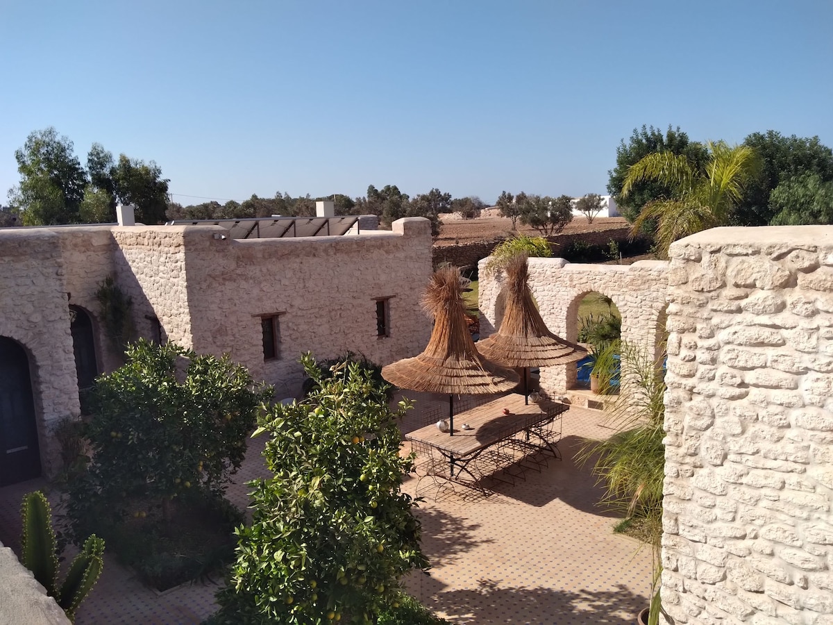 Marion und Saïd sind zwei Schriftsteller, auch Kick-Boxer und für die eine Psychologin und Psychotherapeutin und für den anderen ehemaligen Direktor eines soziokulturellen Zentrums. Sie bauten dieses Haus von 600 m2 auf einem Grundstück von 25.000 m2 inmitten eines Arganwaldes. Die nächste Wohnung ist 500 m entfernt. Der Flughafen Mogador ist 6 km entfernt und Essaouira ist 23 km entfernt. Das Haus besteht aus 2 Schlafzimmern und 4 Suiten von 45, 55, 70 und 90 m2, einem Wohnzimmer von 110 m2 (6 m Höhe). a/ Das 30 m ² große Zimmer "KURKUMA" mit Kamin und Bad (Bad = Toilette + Waschbecken + Badewanne) (ideal für 2 Erwachsene + ein Baby) b/ Das 35 m2 große "MOKKA" -Zimmer mit Kamin, Sitzecke und Bad ( ideal für 2 Erwachsene + 1 Kind), mit Klimaanlage. c/ Die 45 m2 große Suite "SAFRANE" mit Kamin, Sitzecke und Bad (2 Erwachsene + 2 Kinder+ 1 Baby) d/ Die 55 m2 große Suite "ZARAK" mit einem Wohnbereich und einem Kamin + einer privaten Terrasse mit Bänken und Tisch + Bad (2 Erwachsene + 2 Kinder) oder 4 Freunden. e/ Die Suite "BLED" von 70 m2 mit 2 Wohnbereichen + Bad plus ( 4 Erwachsene + 1 Kind + 1 Baby) mit Klimaanlage. f/90 m2 große Suite „AZUR“ mit 2 Schlafzimmern + 2 Bäder + 1 Wohnzimmer (6 Erwachsene) mit Klimaanlage. Eine Terrasse, ein Pool (während der Wintersaison nicht verfügbar), ein Hammam von 12 m2, ein Boxring und Boxsäcke im Freien, eine Bibliothek, Gärten und Terrassen. Die traditionelle marokkanische Küche ist mit Bio-Produkten zubereitet. 5% des Nettogewinns gehen an den lokalen Entwicklungsverband Ida o blal ... Um zu uns zu kommen, muss man mit dem Auto fahren. Wir raten Ihnen von Taxis ab, die nicht gerne die Strecke nehmen. Seit Januar 2019 ist der Zugang direkt und 13 Minuten vom Flughafen (30 Minuten von Essaouira) entfernt. Man braucht 6 km nicht gedämpfter Piste mit 6 km. Mit unserem Dacia Logan fahren wir selbst durchschnittlich 50 km/h. Es dauert 300 bis 450 Dirham pro Tag je nach Saison für einen Mietwagen vom Typ Dacia, aber es scheint, dass es besser ist, am Flughafen in Marrakesch oder Essaouira in den internationalen Internetvermietungsagenturen zu mieten, es liegt an Ihnen. Das Haus ist auf einem Hügel gebaut. Der Panoramablick von 360 ° ist atemberaubend über 15 km. Ein sehr günstiger Ort für einen langen Aufenthalt rund um Lesen, Schreiben, Meditation oder einfach nur das Nichtstun am Pool und seinem Wasserfall. Für die Vollpension bieten wir Ihnen neben dem Frühstück, das bereits im Zimmerpreis enthalten ist (bestehend aus hausgemachtem Brot, Buttermarmelade, frischem Orangensaft und Heißgetränk), ein Mittag- und Abendessen mit Bio-Gemüse aus unserem Garten (unser Haus befindet sich auf einem Grundstück von 25.000 m2), einschließlich traditioneller marokkanischer Gerichte (eine Vorspeise, ein Hauptgericht und ein Dessert mit einer Flasche Mineralwasser und einem Kaffee oder Kräutertee aus unserem Garten, nach Wahl): 20 Euro pro Erwachsener 2 Mahlzeiten mittags (8 Euro) und abends (12 Euro) 14 Euro für Kinder von 5 bis 13 Jahren (Mittag 6 Euro und Abend 8 Euro) Kostenlos für Kinder unter 4 Jahren. Möglichkeit der Wäsche für 5 Euro pro Maschine. Der Pool ist kostenlos, aber das Hammam ist gebührenpflichtig. Zur Information: Die Fluggesellschaften TRANSAVIA (Air France / KLM-Gruppe) und Raynair werden ab sofort Essaouira von Orly, Brüssel und Marseille aus bedienen (ab 1. März). Für weitere Informationen stehen wir Ihnen gerne zur Verfügung! Marion&Saïd