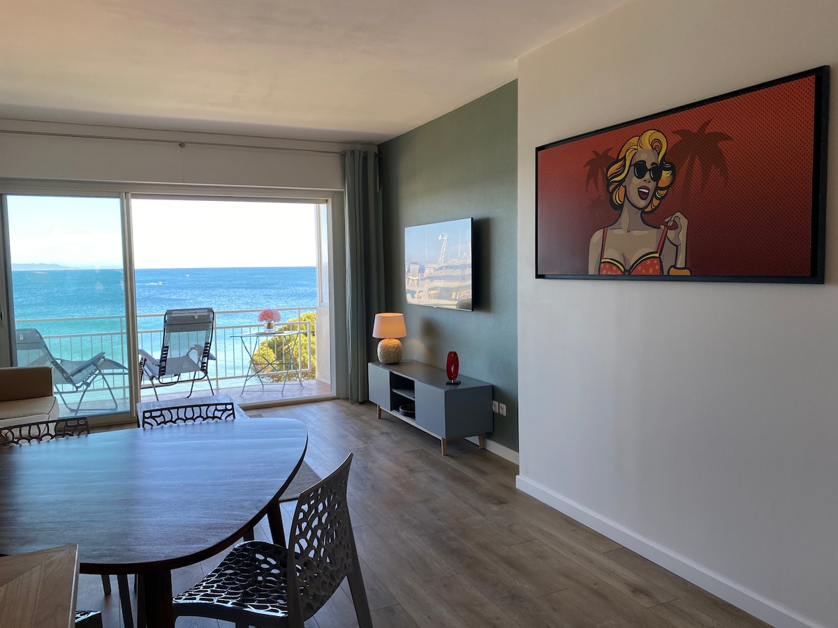 Renovierte Wohnung am schönen und langen Strand von La Bergerie Mit Blick auf das Meer, Füße im Wasser direkt am Strand, begrüßen Sabine und Sébastien Sie in ihrem schönen modernen Kokon. Wahre Oase der Ruhe für Liebhaber des Meeres, Sie werden es nicht aus den Augen lassen und können den Sonnenaufgang über den Îles d'Or von Ihrem Bett aus genießen. Gemütliche und herzliche Atmosphäre, die Wohnung und ihre Terrasse von 27 m2 befinden sich am Ende der Residenz für mehr Privatsphäre.