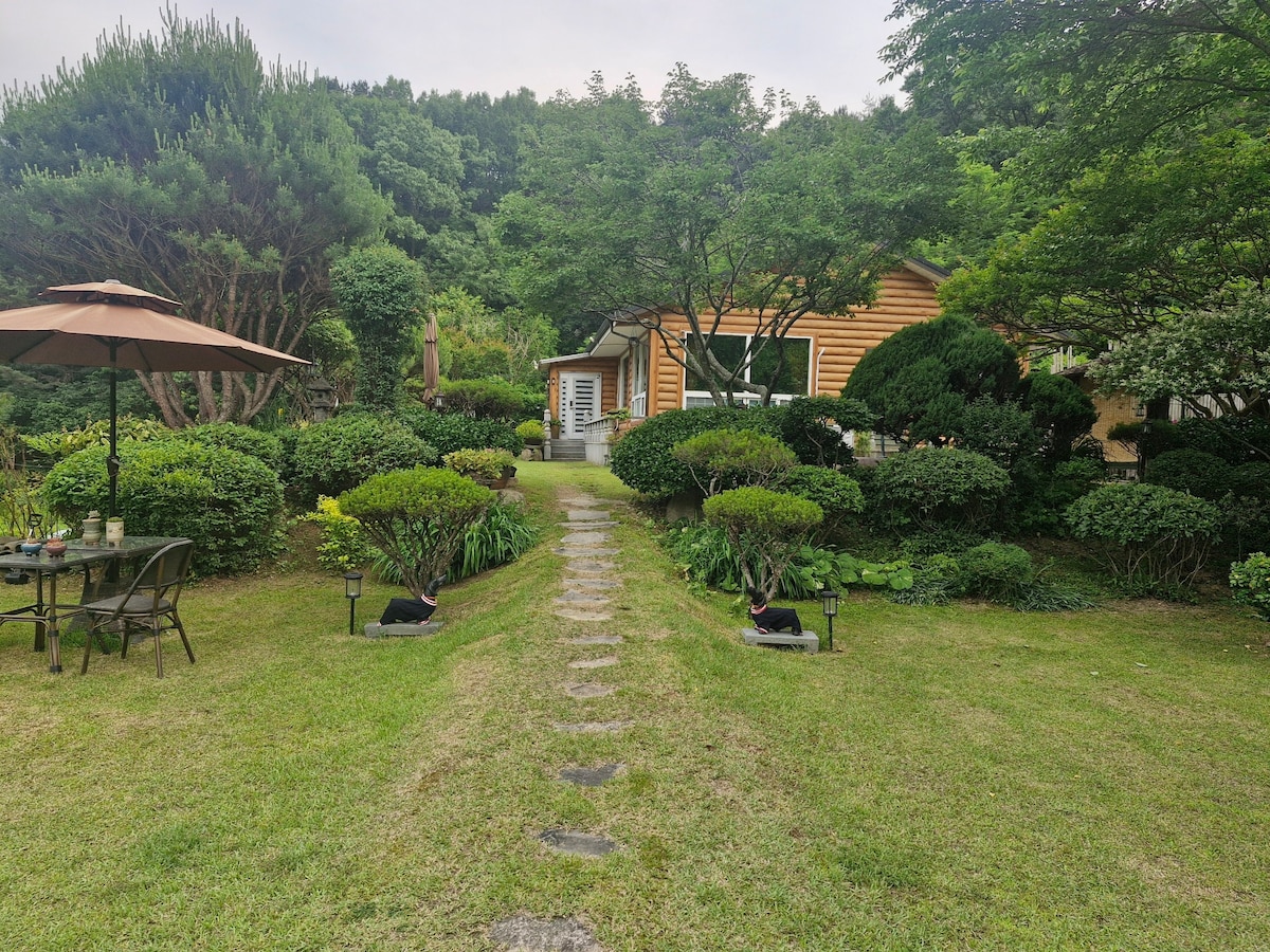 Es ist ein Landhaus mit mehreren Obstbäumen in einer Höhe von 420 m unter dem Samdobong des demokratischen Berges, abseits der belebten Touristenattraktionen des Deokyusan-Nationalparks und des Muju Resorts. Es dauert etwa 10 Minuten nach Taekwondo Won und Bandiland und 25 Minuten zum Deokyusan Muju Resort. Im Hinterland des Dorfes kannst du auch die natürliche Schönheit des Tals genießen. Uncle House ist das isolierteste Gebäude im amerikanischen Stil, das von Seouls renommierter Holzbauunternehmen entworfen und gebaut wurde. Die Decke ist hoch, der Sommer ist kühl und der Winter ist ein warmes Haus, eine hohe und weit offene Aussicht und ein heißer Ort, um die Feuerstelle mit Sternenblick zu genießen. Der erste Stock ist der Raum des Gastgeber-Paares und die 56 m ² (einschließlich der Terrasse) im zweiten Stock ist das Gästehaus. Es hat einen separaten Eingang, und es ist kein unangenehmes Haus, weil es einen Gastgeber gibt, aber es wird mehr geschätzt, weil du sofort Hilfe und Service erhalten kannst. Uncle Style BBQ ist ein großartiger Ort für eine amerikanische Familie, und die kulinarischen Fähigkeiten, die vom Haus von Onkel begleitet sind, sind sehr talentiert. Der Wintergarten mit privatem Außenkamin ist mit Abstand das Beste ♡