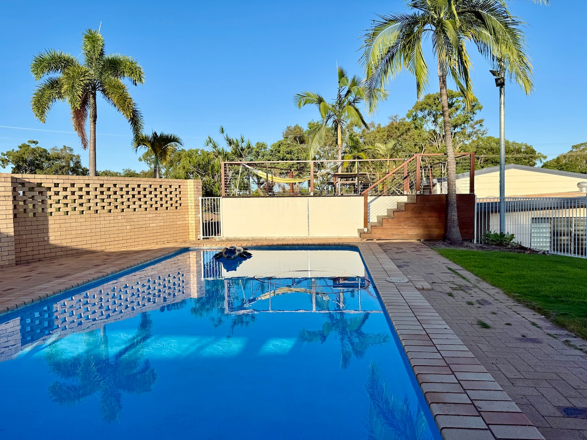 Willkommen in deinem friedlichen Rückzugsort in Tannum Sands, nur 600 Meter von unberührten Stränden und nur wenige Gehminuten vom Herzen der Stadt entfernt. Perfekt für Familien, Arbeiter oder Gruppen, bietet dieses geräumige Haus alles, was man für einen erholsamen Kurzurlaub braucht. • 3 Queensize-Schlafzimmer + Doppelsofa • Entspannte Unterhaltung: Mehrere Innen- und Außenbereiche mit Grill, Großbild-Smart-TV und vielen Sitzgelegenheiten • Süßwasserpool. • Ausreichend Parkplatz: Platz für Autos, Boote und Camper - bringe alle deine Abenteuer mit
