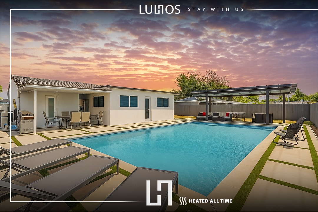 Welcome to your dream vacation home near Miami International Airport! This modern 4-bedroom retreat offers the perfect mix of comfort and entertainment. Enjoy a cozy dining area with ambient lighting and step outside to a stunning patio featuring a heated pool, gazebo, BBQ grill, sofas, sun loungers, a playground, trampoline, and pool table. Designed for relaxation and fun, this home is ideal for creating unforgettable memories with family and friends.