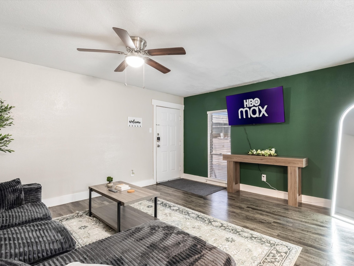 Übernachte stilvoll und komfortabel in dieser neu renovierten Wohnung in Arlington! Zu Fuß zum AT&T Stadium und nur 1 Meile zum Globe Life Field & Park, in der Nähe von UNT & Six Flags. Geräumiges 1 BR mit einem luxuriösen Bett, Ledersofa, voll ausgestatteter Küche mit Granitarbeitsplatten, modernisiertem Badezimmer und 3 großen Schränken. Professionell gereinigt und mit Sorgfalt gehostet, ist es dein perfekter Ausgangspunkt für Veranstaltungen oder Sightseeing. Brauchst du zusätzlichen Platz? Frag einfach!