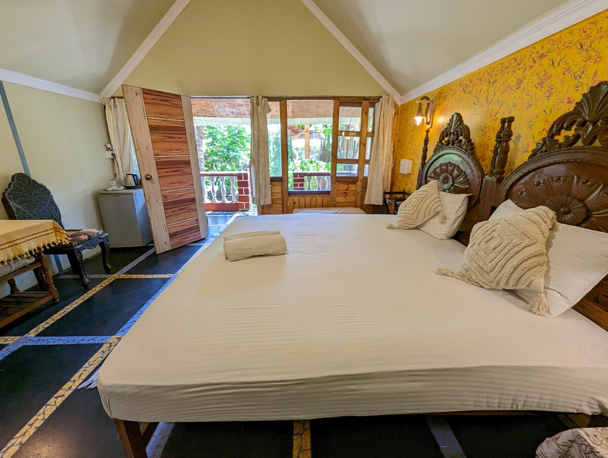 Dhanya Garden view Cottage at Patnem a colourful wooden cottage on stilts offers an elevated view of the surrounding lush greenery of north end of Patnem beach. The bedroom comes with a large canopied bed and air-conditioning to ensure your perfect slumber. A mini fridge, fresh towels and linen are provided in the room. The en-suite bathroom features a semi-open shower facility complete with free bath amenities.The cottages comes with a terrace with seating area where guests can laze around.