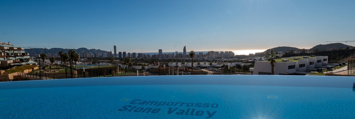 Luxus und Komfort in dieser 2-Zimmer-Wohnung mit Panoramaterrasse: Meerblick und die Skyline von Benidorm🌅. Es bietet Entspannung und Spaß und befindet sich in einem exklusiven Komplex mit kostenlosem Zugang zu Sommer- und Winterpools, Fitnessraum, Spa (Sauna und Whirlpool), Paddle-Tennisplatz, Minigolf und Kinderspielplatz. Vollausgestattete Küche und High-Speed-Internet. Eine 5-minütige Fahrt zum Strand von Poniente und Finestrat und 40 Minuten vom Flughafen entfernt. Ideal für Familien und Gruppen.