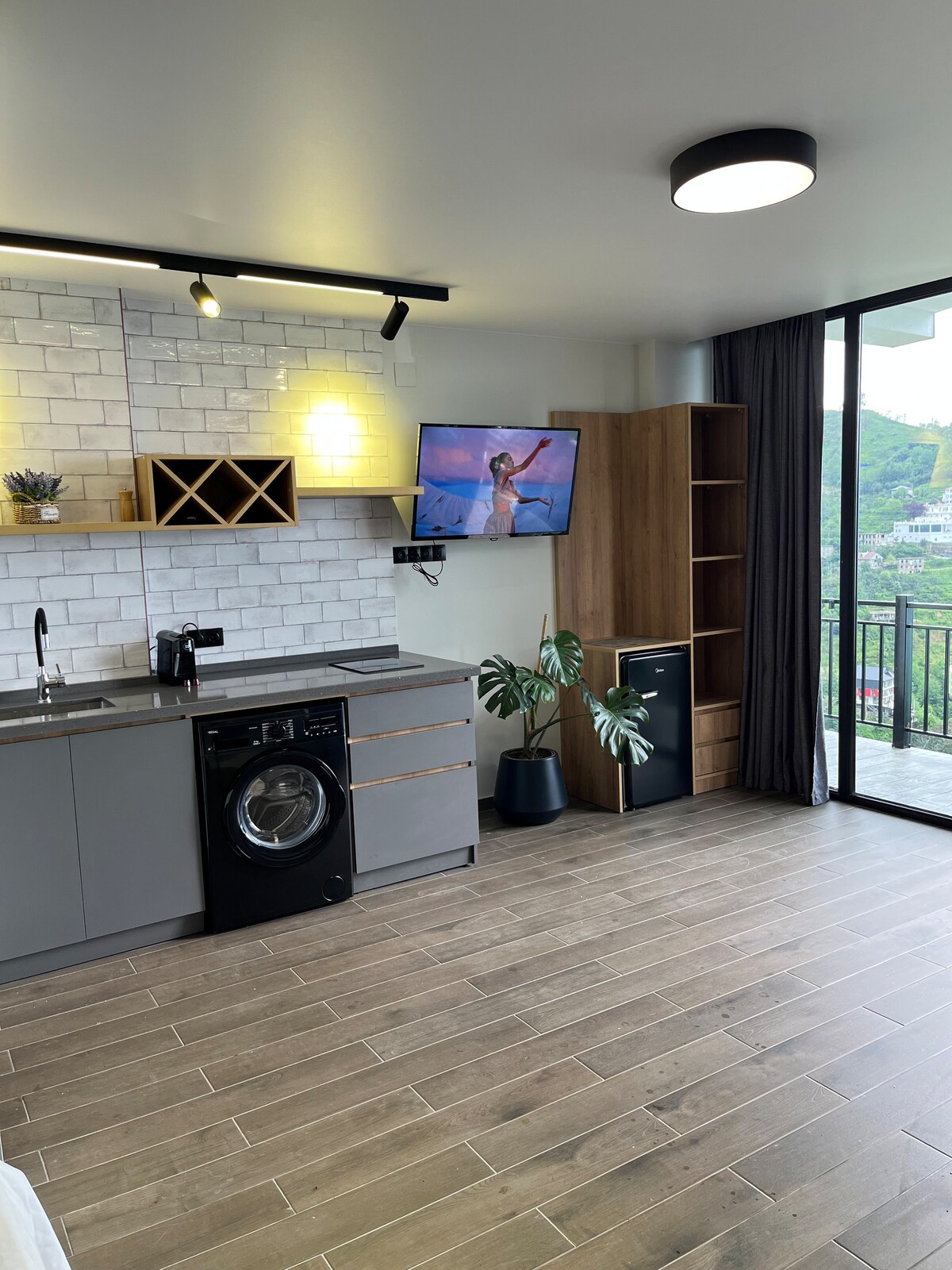 The apartment is located on the 9th floor, in the most beautiful part of the Adjara region called Gonio, close to the best beaches of Batumi. There is free parking on site. Two-bedroom apartments with a beautiful terrace overlooking the sea are ideal for couples, business travelers, and families (with children). Also at your disposal is an XBOX Series S, a projector, an audio system, board games, books, and an umbrella for comfortable sunbathing. P.S. There is also a playpen-bed.
