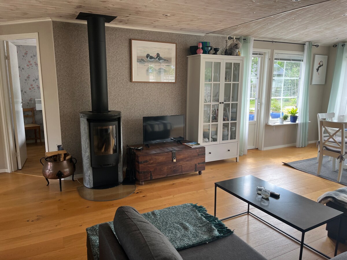Willkommen in unserem architektonisch gestalteten Traumhaus mit 110 m². Das Haus ist in drei Schlafzimmer, ein Wintergarten, ein Badezimmer, eine Küche, ein Esszimmer und ein Wohnzimmer auf dem Dachboden aufgeteilt. Vom Dachboden aus gelangen Sie auch auf die Dachterrasse, die einen weiten Blick auf die Ostsee bietet. Das verglaste Orangerie ist das Bindeglied zwischen Wohnzimmer und Schlafzimmerbereich. Hier können Sie sitzen und die Sterne beobachten oder ein Feuer im Kamin anzünden. Das Badezimmer verfügt über eine versenkte Badewanne aus Kalkstein. Bungenäs ist ein einzigartiges Gebiet, frei von Autos, Parkplatz 800 m vom Haus entfernt.