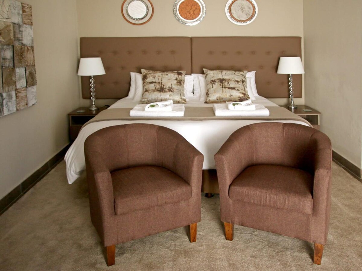 Our Luxury Cottage includes bathroom amenities, braai facilities, daily cleaning, coffee/tea setup, DStv, kitchenette, Wi-Fi, and a patio. It also features two single beds for kids 12 and under, making it ideal for families.