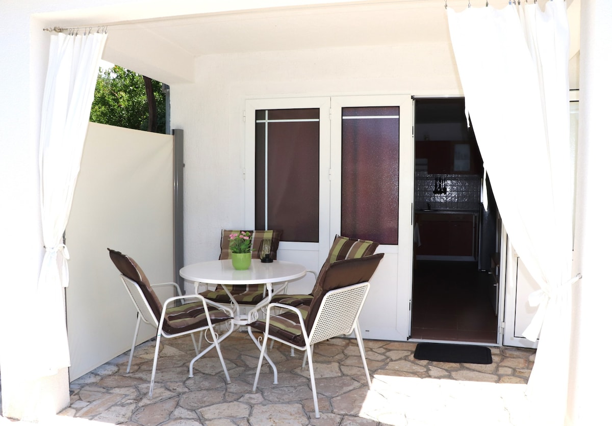 Willkommen in unserer Ein-Zimmer-Wohnung in Barbat auf der Insel Rab, nur 10 Gehminuten vom Strand entfernt. Es verfügt über eine eigene Terrasse mit Meerblick, ideal, um Getränke zu schlürfen und die frische Luft zu genießen. Du kannst auch eine gemeinsame Terrasse mit einem Garten und einem Kamin genießen. Außerdem stellen wir dir WLAN, eine Klimaanlage und einen kostenlosen Parkplatz vor dem Haus zur Verfügung.
