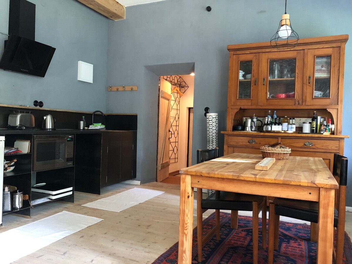 Nachhaltig sanierte und voll ausgestattete Ferienwohnung für 2 Personen mit bis zu 1 Kind (-6 Jahre) und/oder einem Baby im ehemaligen Bauernhaus mit Sauna, ruhig in der Mitte des Ortes ohne Durchgangsverkehr gelegen, riesiger Garten mit altem Obstbaumbestand, 2 Badeseen im Ort, kostenloses WLAN, Hunde willkommen. Ländliche Umgebung. Auf Nachfrage ist Halbpension möglich. Die Gerichte werden mit Produkten aus dem Garten oder der Region frisch zubereitet.