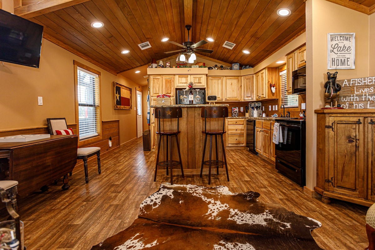 Willkommen im Loft, einem winzigen, HAUSTIERFREUNDLICHEN Raum in einem Golfplatzviertel in der Nähe des Sees. Wir haben diesen gemütlichen Raum mit Blick auf Komfort, Charme und Effizienz gebaut und gestaltet. Nimm die Leiter zum Queensize-Bett (niedrige Decke) mit Blick auf die Küche oder genieße einen Film im Heimkino. Eine gut ausgestattete Küche sorgt dafür, dass du dich wie zuhause fühlst. Du bist in der Nähe von allem, was das historische Granbury zu bieten hat. Es gibt Platz zum Parken deines Bootsanhängers und eine öffentliche Bootsrampe ist weniger als eine Meile entfernt.