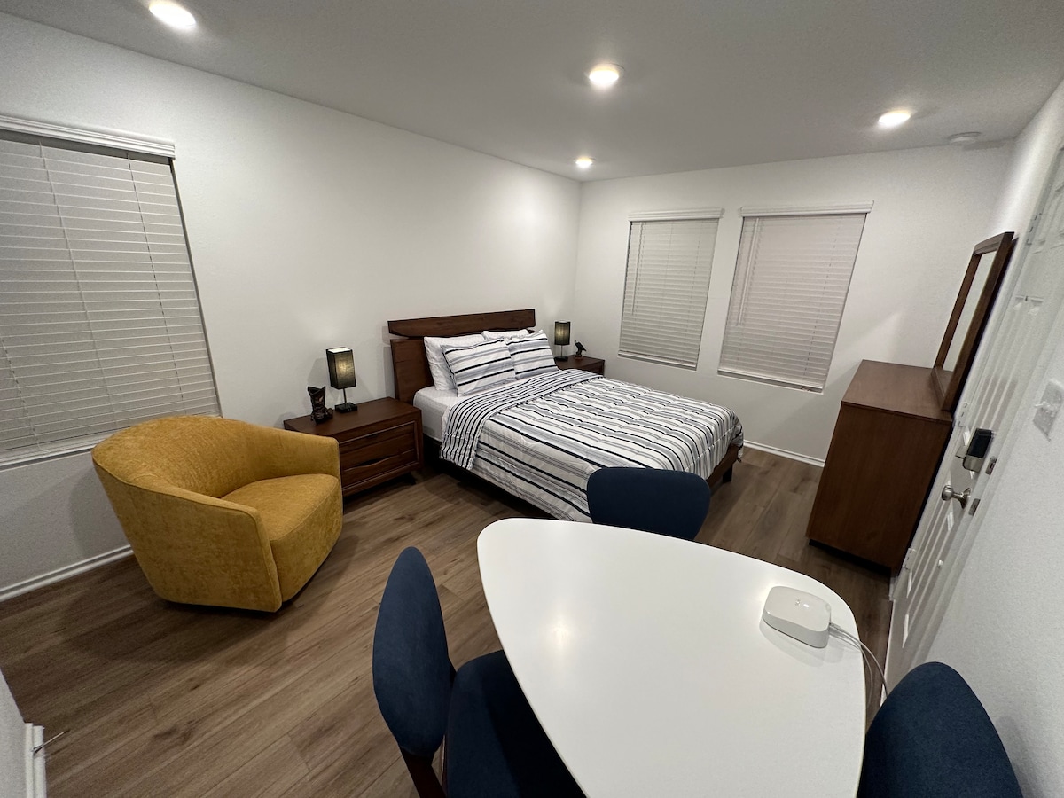 Dies ist der perfekte Ort, um nach einem langen Tag mit der Familie und/oder Freunden in der Gegend zu entfliehen! Sie ist geräumig, gemütlich, komfortabel (CA-Kingsize-Bett), ERSCHWINGLICH, zentral gelegen und sehr privat. Obwohl diese Wohnung an mein Zuhause angeschlossen ist, wirst du mich höchstwahrscheinlich nie sehen. Du hast einen komplett separaten Eingang mit einer privaten Terrasse und einem Hof für dich allein.