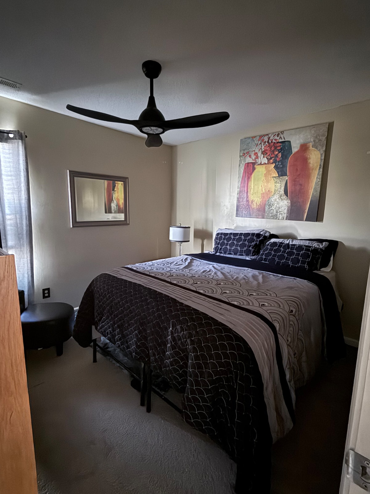 Fröhliches Schlafzimmer mit Queensize-Bett.
