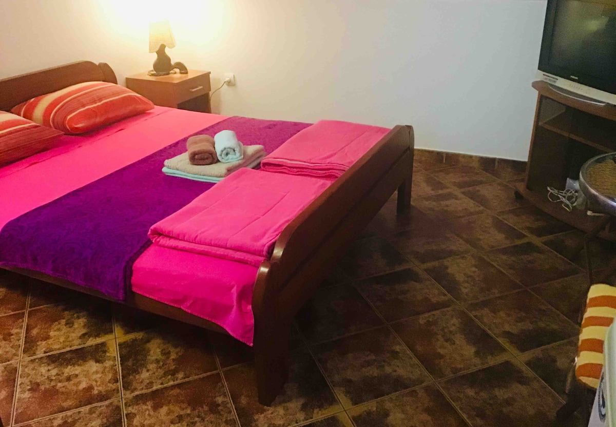 Gemütliche und komfortable Wohnung mit einer Terrasse, die einen Blick auf die Mauern der Altstadt, die Kirche und die Berge bietet. Ein kostenloser, geräumiger Fitnessraum ist inbegriffen. Sehr ruhige, sichere und freundliche Nachbarschaft – nur 5 Gehminuten von der Altstadt, dem Busbahnhof, der Tankstelle, den Stränden, Supermärkten, Bäckereien, Restaurants, Fast-Food-Läden, der Apotheke entfernt. Bonus – ein kostenloser privater/eingezäunter Parkplatz, ein Hof und ein Obstgarten, von dem du einige frische und Bio-Früchte pflücken und essen kannst.