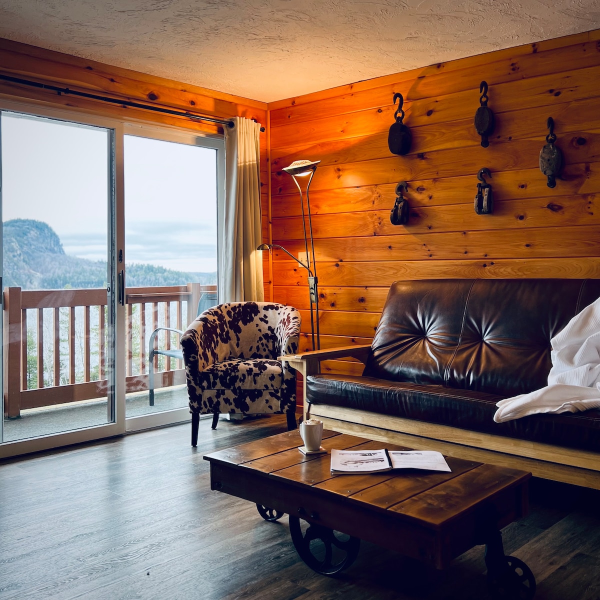 Hütte am See mit geräumiger Terrasse und Gasgrill. Geräumiger Wohnbereich mit viel natürlichem Licht und Naturholz-Innenausstattung. Große Terrasse, um mit den Klängen der Natur aufzuwachen. Verbringe morgens mit Angeln vor der felsigen Küste, bevor du mit einem Kanu oder Kajak losziehst, und setze dich dann an die Feuerstelle und entspanne dich. Bücherregal voller Spiele, Bücher und DVDs, um alle zu unterhalten. Die Küche ist komplett mit allen notwendigen Geräten ausgestattet, um köstliche Mahlzeiten zuzubereiten.