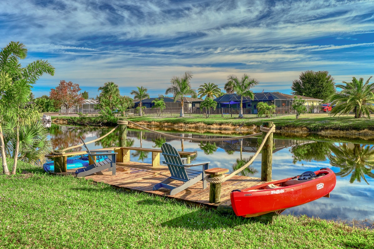*BEHEIZTER SOLARPOOL* Willkommen in deiner tropischen Oase in Englewood, Florida! Tritt nach draußen und bereite dich darauf vor, vom atemberaubenden Außenbereich begeistert zu sein. Der beheizte Pool mit Solarmodul lädt an warmen Tagen in Florida zu einem erfrischenden Bad ein. Stell dir vor, du nippst an deinem Lieblingsgetränk, während sich der Himmel jeden Abend in eine Leinwand mit leuchtenden Farben verwandelt. Für die Angelbegeisterten wartet ein privater Steg auf deine Ankunft. Wirf deine Schlange und genieße die Gelassenheit des Sees, alles bequem von deinem Garten aus.