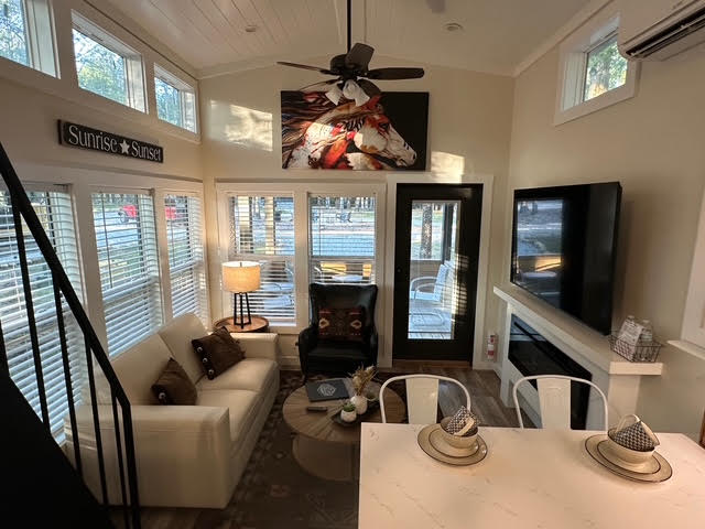 Still Waters is a luxury waterfront tiny home created and inspired to bring rest, restoration, and re-connection for your soul. Escape into nature while lounging on one of the spacious decks or sitting around the campfire while admiring the beautiful sunsets or gazing at all the stars. The tiny home sits on 1 acre with large trees encompassing the home with lake access to canoe, kayak, or fish. This is the perfect place to slow down, unwind, and enjoy the beauty of nature all around.