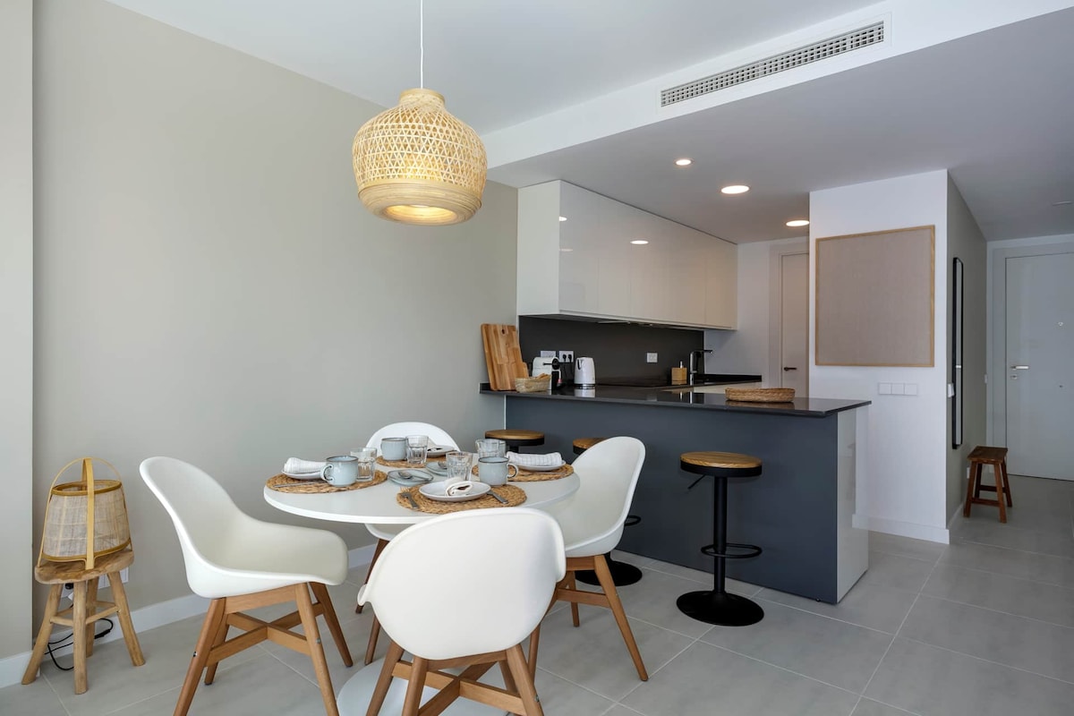 Bass mit 2 Schlafzimmern, eines mit einem Doppelbett und eines mit zwei Einzelbetten, ideal für Familien oder kleine Gruppen. Enthält 2 Badezimmer für zusätzlichen Komfort. Die offene Küche lässt sich in ein helles, modernes Wohnzimmer integrieren und schafft einen gemütlichen Raum zum Entspannen. Darüber hinaus verfügt sie über eine private Terrasse und einen Garten, perfekt, um das mediterrane Klima zu genießen. ¡Eine ideale Option für unverzeihliche Ferien!