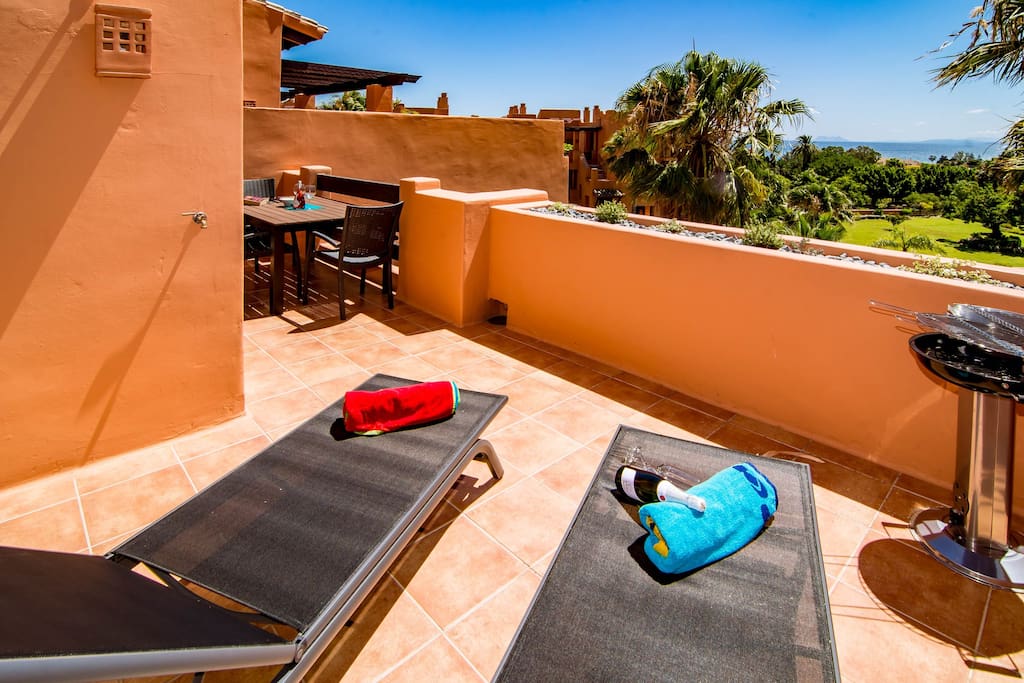 Modern, stylish apartment between Banús and Estepona on the New Golden Mile. Bright living area, full kitchen, 2 bedrooms + extra sofa bed in the living room (up to 5 guests). Private outdoor dining with sea view, shared BBQ, garden, near beach and dining. Ideal Costa del Sol getaway!