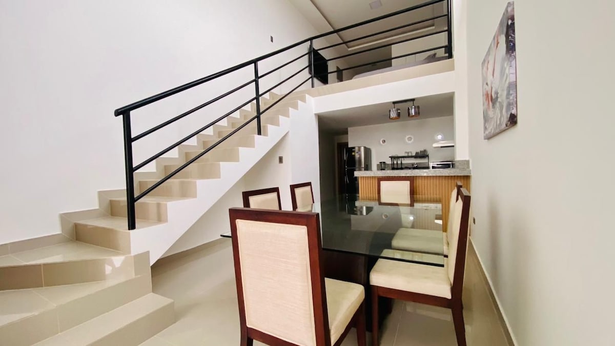 Willkommen in Puerto Santa Ana - Loft River. Erlebe ein einzigartiges Erlebnis in diesem eleganten Loft im Mezzanin-Stil im Herzen von Puerto Santa Ana, Guayaquil. Sein modernes Design und der Blick auf den Fluss Guayas laden zum Entspannen und Genießen der Landschaft ein. Von seinen Fenstern aus kannst du die Aerovía, die Promenade und die schönen Sonnenuntergänge der Stadt bewundern. Komfort, Stil und erstklassige Lage erwarten dich, umgeben von Restaurants, Cafés und der Atmosphäre der Uferpromenade. Dein vorübergehendes Zuhause vor dem Fluss.