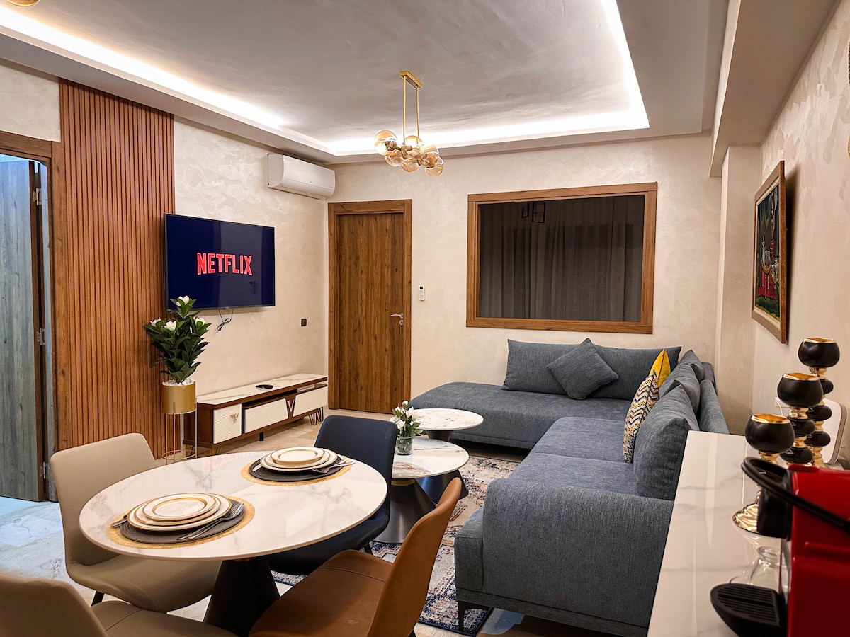 Comfort in the Heart of Marrakech This 60 m² apartment ideally located: 1 minute from Carré Eden 5 minutes from the train station 12 minutes from the airport Perfect for 2 guests! What you'll love: *A queen-size bedroom with a beautifully designed living area *HD TV with IPTV *A fully equipped kitchen *High-speed 100 Mbps internet *Terrace with a beautiful view, a deckchair & a table Whether you're visiting for business or leisure, this apartment offers the perfect base for your stay.